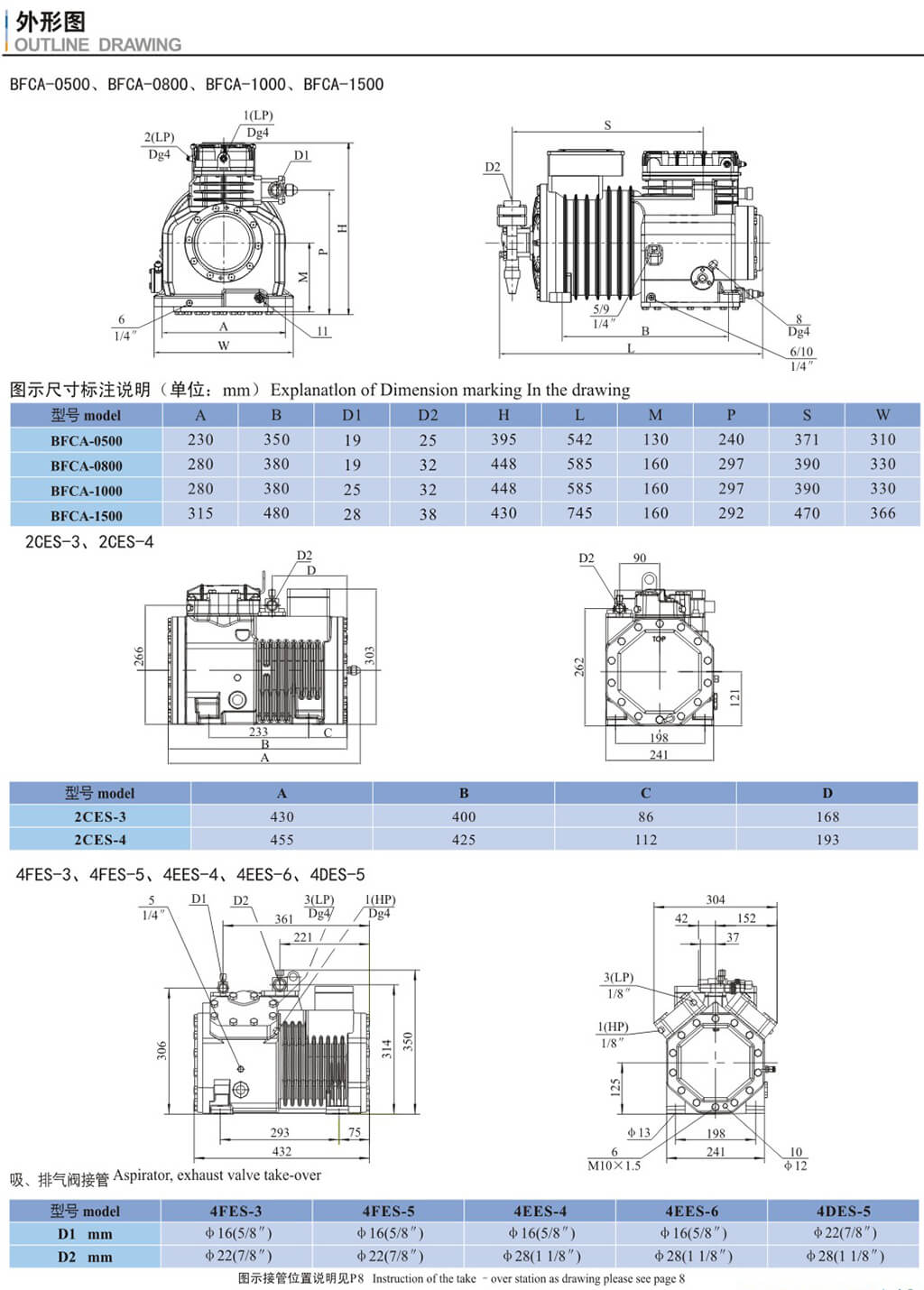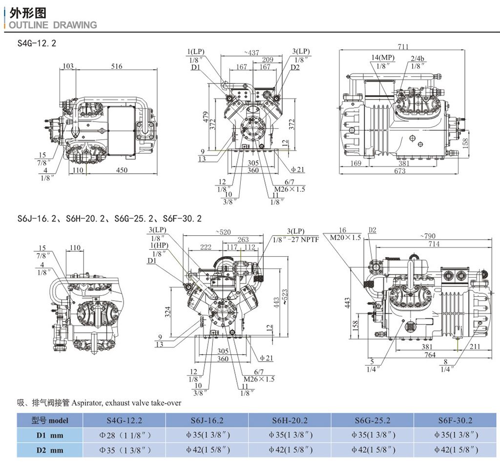 15.喷液口(不带液体过冷器。热力即胀阀运行) 16.油压差开关"Dlta-P"连接 17.液体过冷器制冷剂入口 18、液体过冷器制冷剂出口 19.热力膨胀资外平衡管接口(带液体过冷器运行) DI.排气阀接口 D2、吸气阅接口 |